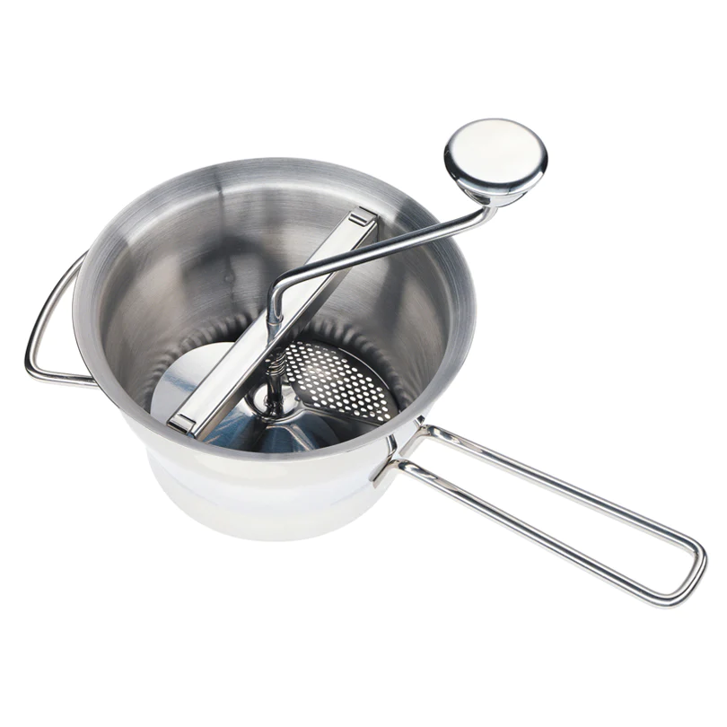 Il maneggeviole passaverdure, realizzato in solido acciaio inossidabile, viene usato per macinare, creare creme, pappe, salse e purรจ dalla verdura, ma anche dalla frutta, separando la polpa dalla buccia e dai semi. Dotato di 3 dischi forati (5 mm, 3 mm e 2 mm) e 1 disco grattugiante, che permettono di sminuzzare sia verdure fibrose che alimenti con buccia dura, come per esempio mele o pomodori. Lavabile in lavastoviglie.