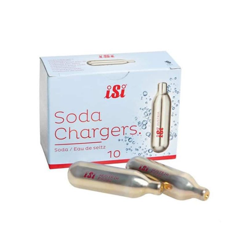 Ogni capsula iSi per Soda contieneย 8 g di CO2 pura eย puรฒ essere utilizzata per la preparazione di 1 L di Seltz.