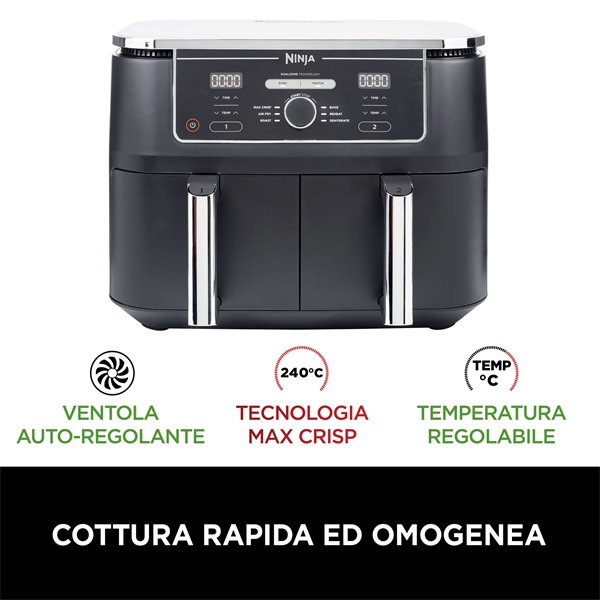 La Ninja Dual Zone MAX AF400EU รจ dotata di una serie di funzionalitร avanzate che la rendono una scelta eccellente per chi cerca un elettrodomestico versatile e capace di gestire piรน preparazioni contemporaneamente. Ecco alcune delle sue caratteristiche principali: