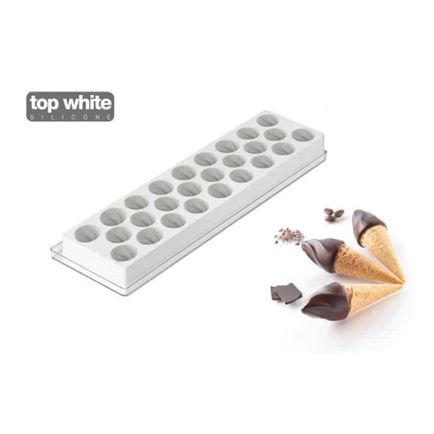 Monoporzioni di gelato che possono essere utilizzate sia per piccoli coni, sia come dessert al piatto. Lo stampo รจ utilizzabile anche per realizzare eleganti ed originali praline e bon bon.