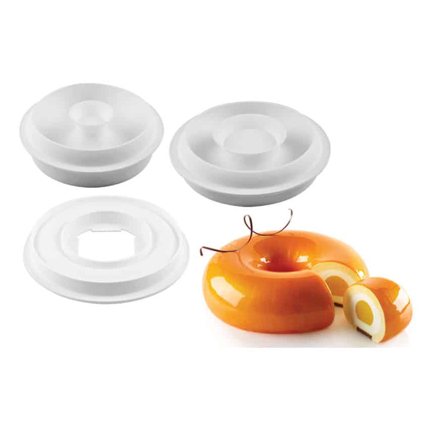 Il Kit Trinity รจ composto da 3 stampi in silicone. Uno per la realizzazione di una preparazione del volume di 1400 ml a forma di ciambella e due per creare gli inserti, sempre a ciampella, ma piรน piccoli.
