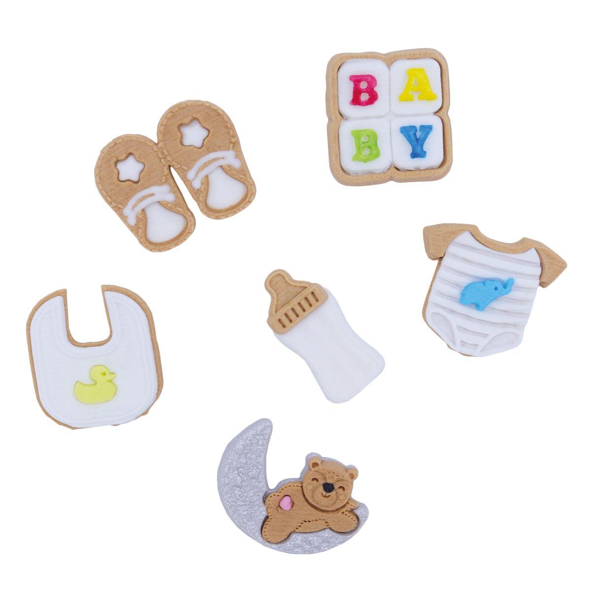- Il set contiene: scarpetta da neonato, cartello per neonato, corredino per neonato, biberon, bavaglino e un orsacchiotto.