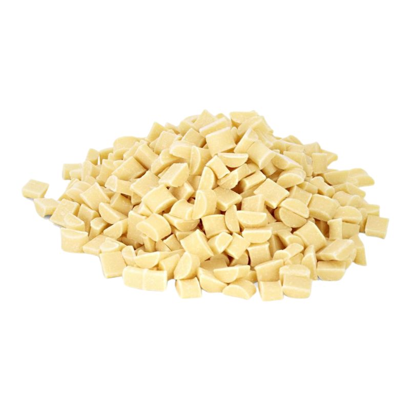 Pezzetti di puro cioccolato bianco perfetti per l’inserimento in impasti lievitati come panettone e colomba e per tutte le preparazioni da forno.