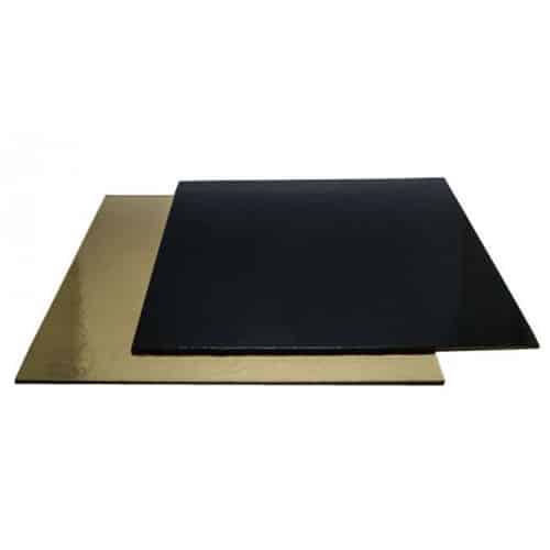 Vassoio sottotorta quadrato in cartoncino realizzato in carta per uso alimentare resistente ai grassi con un lato di colore oro ed uno di colore nero.