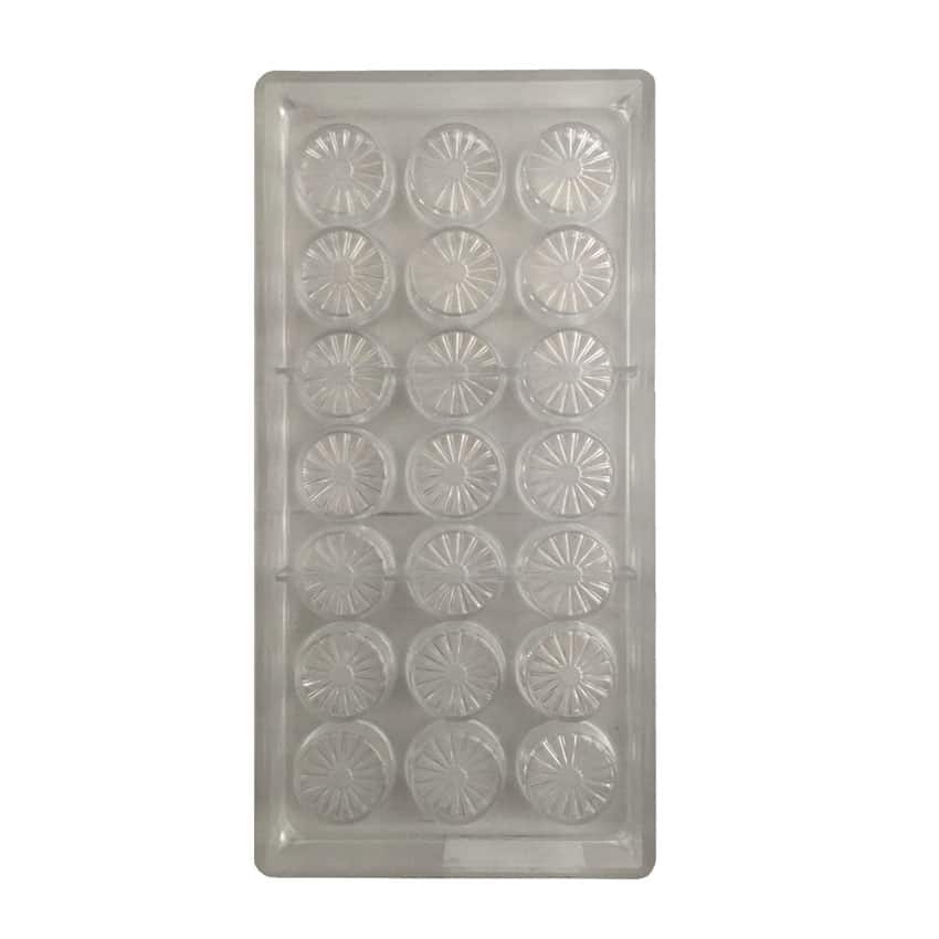 Lo Stampo 21 cioccolatini Tondi con Fiore รจ uno stampo Professionale inย Policarbonato per la realizzazione di 21 praline a base rotonda.