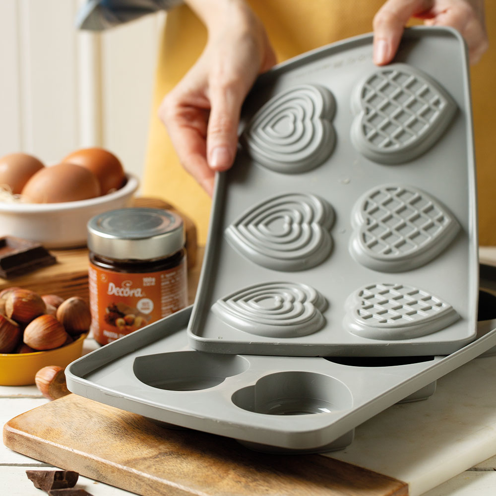 Set 2 stampi in silicone* con 6 cavitร a forma di cuore, di due profonditร diverse, ideali per preparazioni dolci e salate. Composto per il 100% da Silicone Platinum*, resistenti sia alla cottura che al congelamento.
