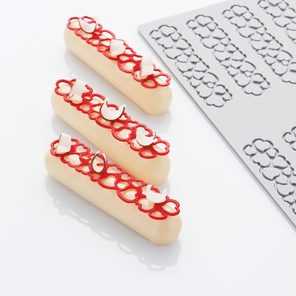 Lo stampo in silicone Éclair Cuori fa parte della linea Pavodecor di Pavoni Italia. Una linea di stampi dedicati alla decorazione per il mondo della pasticceria.
