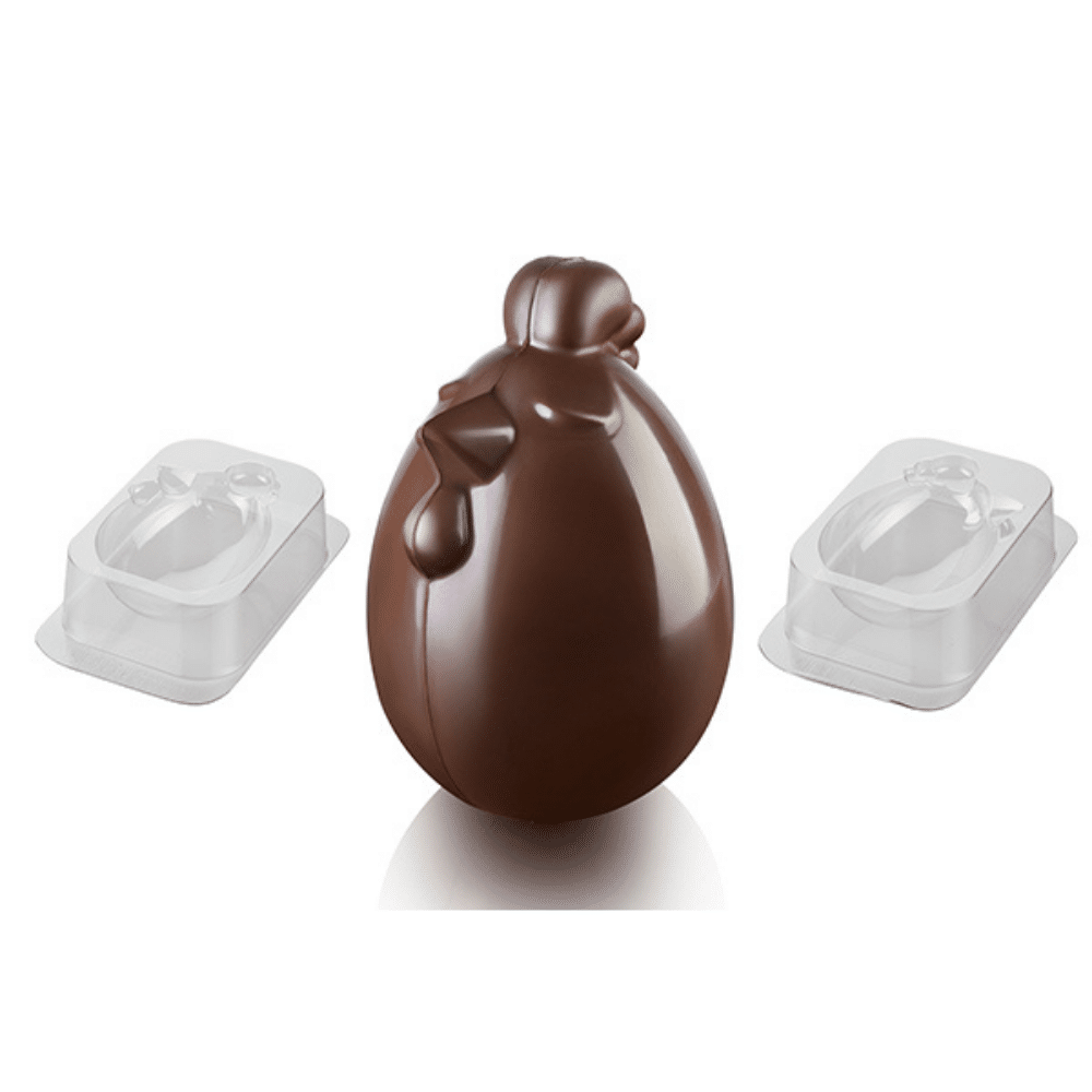 Kit di stampi termoformati riutilizzabili creati dai designer di Silikomart per la realizzazione di soggetti 3D in cioccolato a forma di gallina.