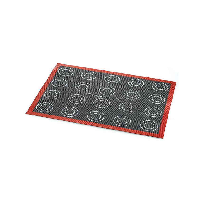 Il tappeto in silicone Éclair & Choux Mat di Silikomart è un tappeto microforato con anima in fibra di vetro ideale per la cottura di bigné ed éclairs.